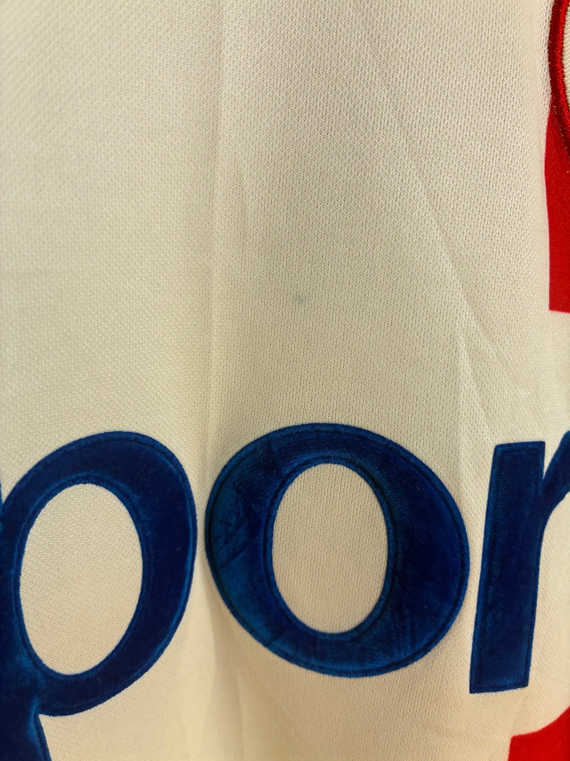 Das Vereinswappen wurde aufgestickt und befindet sich ebenso wie alle Nähte in tollem Zustand. Der Spielername und die Nummer (Flock-Material) wurden aufgedruckt und befinden sich in neuwertigem Zustand. Die ein oder andere minimale Verfärbung. Ein Fadenzieher rechts unter dem Vereinswappen. Unterschrift von Aufstiegskapitän Alexander Schur.