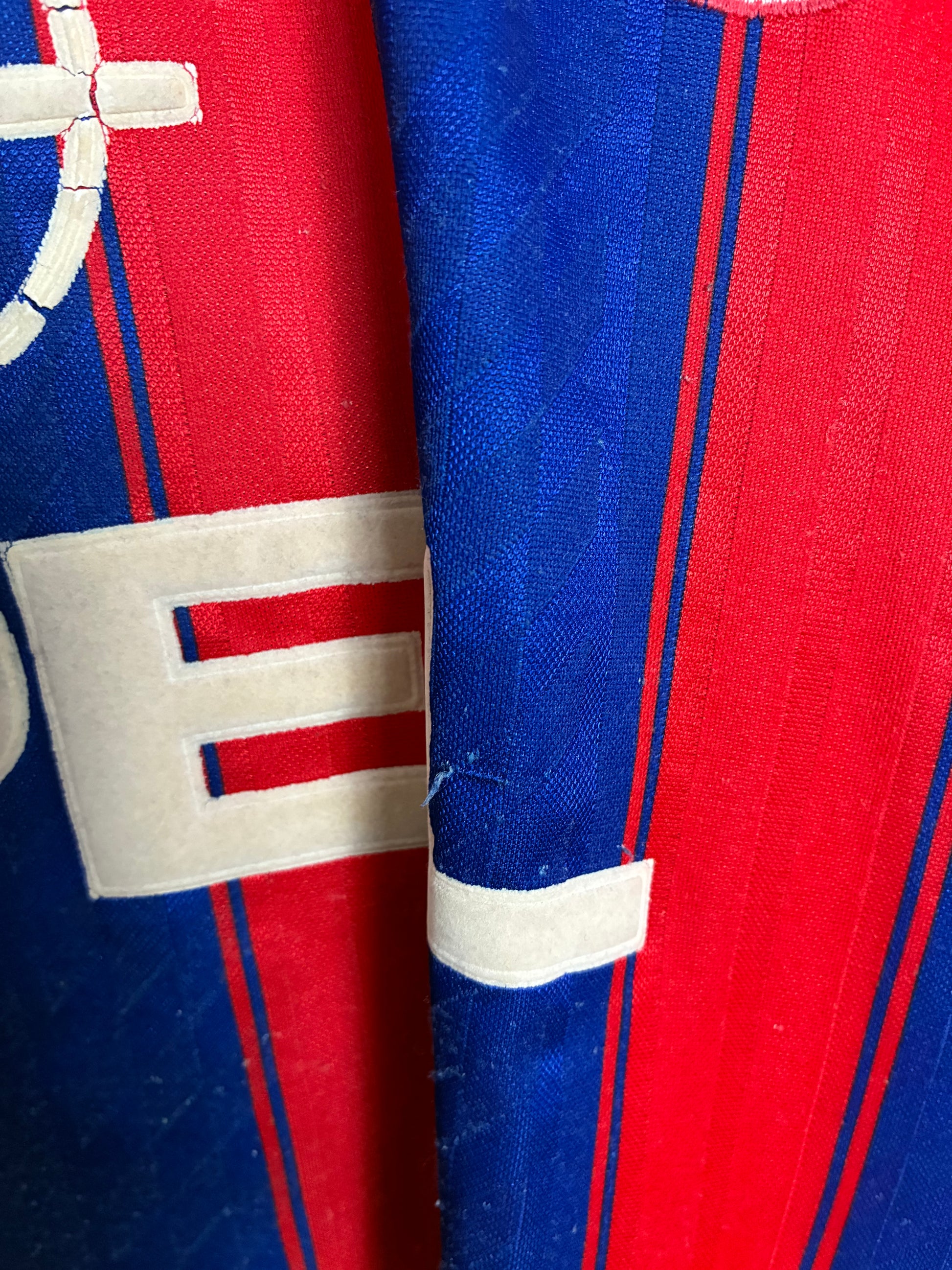 Mehrere Gebrauchsspuren am Stoff. Starke Gebrauchsspuren am Brustsponsoren. Gebrauchsspuren am Vereinsnamen auf der Rückseite. Gelbliche Verfärbung des Brustsponsoren und des Vereinsnamens. Es handelt sich hier um den Original-Flock aus dieser Zeit.