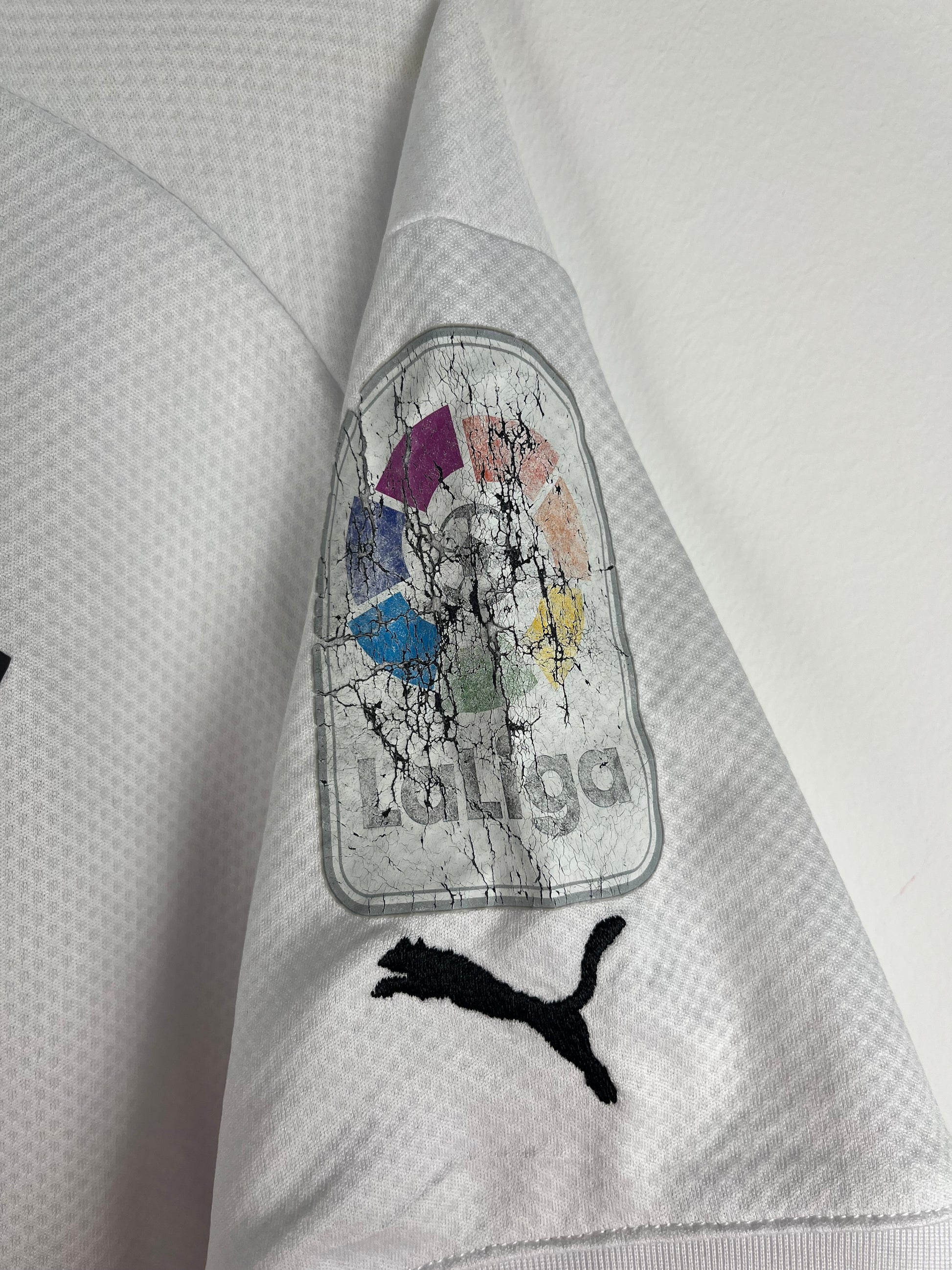 Der La Liga Patch auf dem rechten Ärmel ist quasi vollständig zerstört. Der Stoff, sowie die Rückenbedruckung weisen leichte Gebrauchsspuren auf. Ansonsten befindet sich das Trikot jedoch in tollem Zustand.