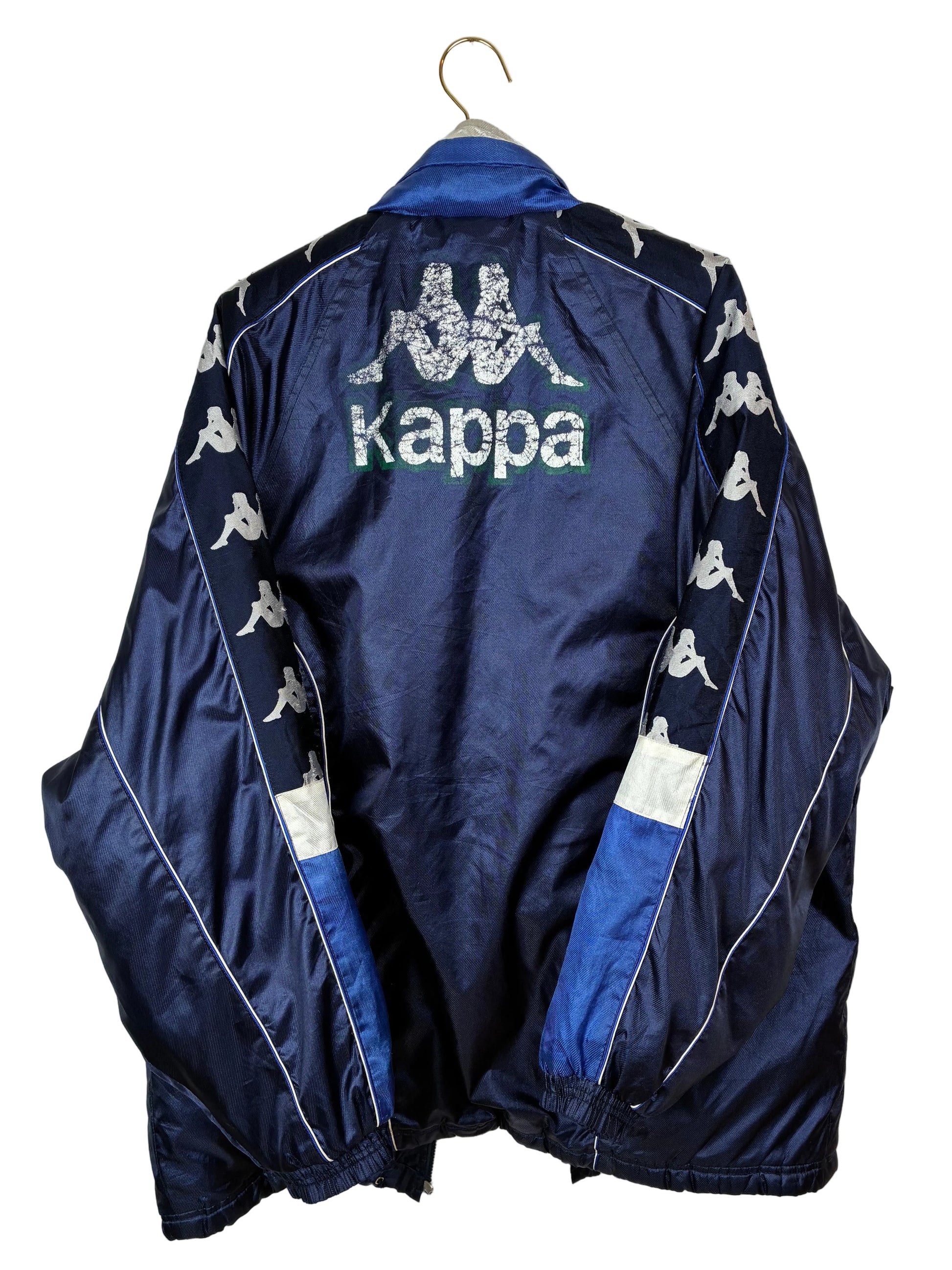 Wunderschöne und sehr seltene Vintage Stadionjacke oder Sideline-Jacket von Betis Sevilla aus der Saison 1997/98. Im Pokal der Pokalsieger konnte "Los Verdiblancos" in dieser Saison das Viertelfinale erreichen. Die Jacke kann sowohl am Kragen, als auch am Bund geschnürt werden und besticht vor allem durch die ikonischen Logos des Herstellers auf den Ärmeln.