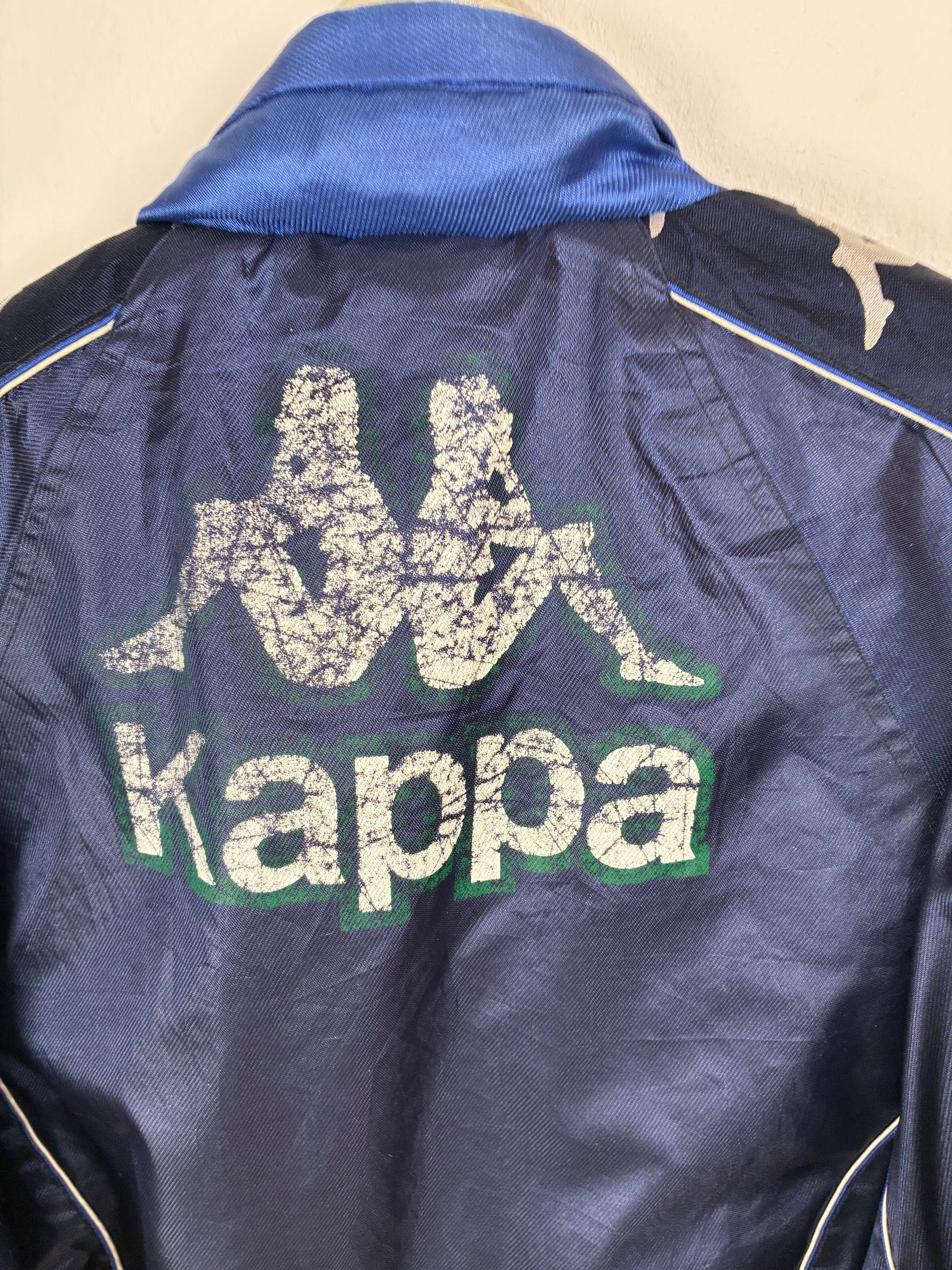 Abnutzung des aufgedruckten Herstellerlogos auf dem Rücken. Gebrauchsspuren am Stoff den Ärmeln sowie Bobbles am Stoff der Innenseite. Vereinswappen auf der Brust, sowie Herstellerlogo auf Brust und Ärmel sind gestickt. Die Jacke wurde definitiv getragen, befindet sich jedoch dennoch in einem guten Vintage-Zustand.