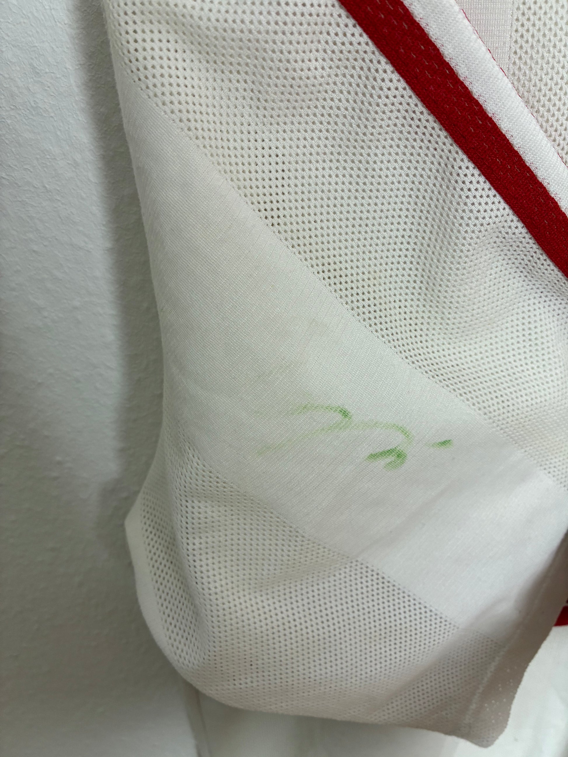 Leichte Verfärbung des Brustsponsors und zwei kleine Verfärbungen (Rücken unten, Brust rechts) sind zu erkennen. Verblasste Unterschriften auf der Rückseite.