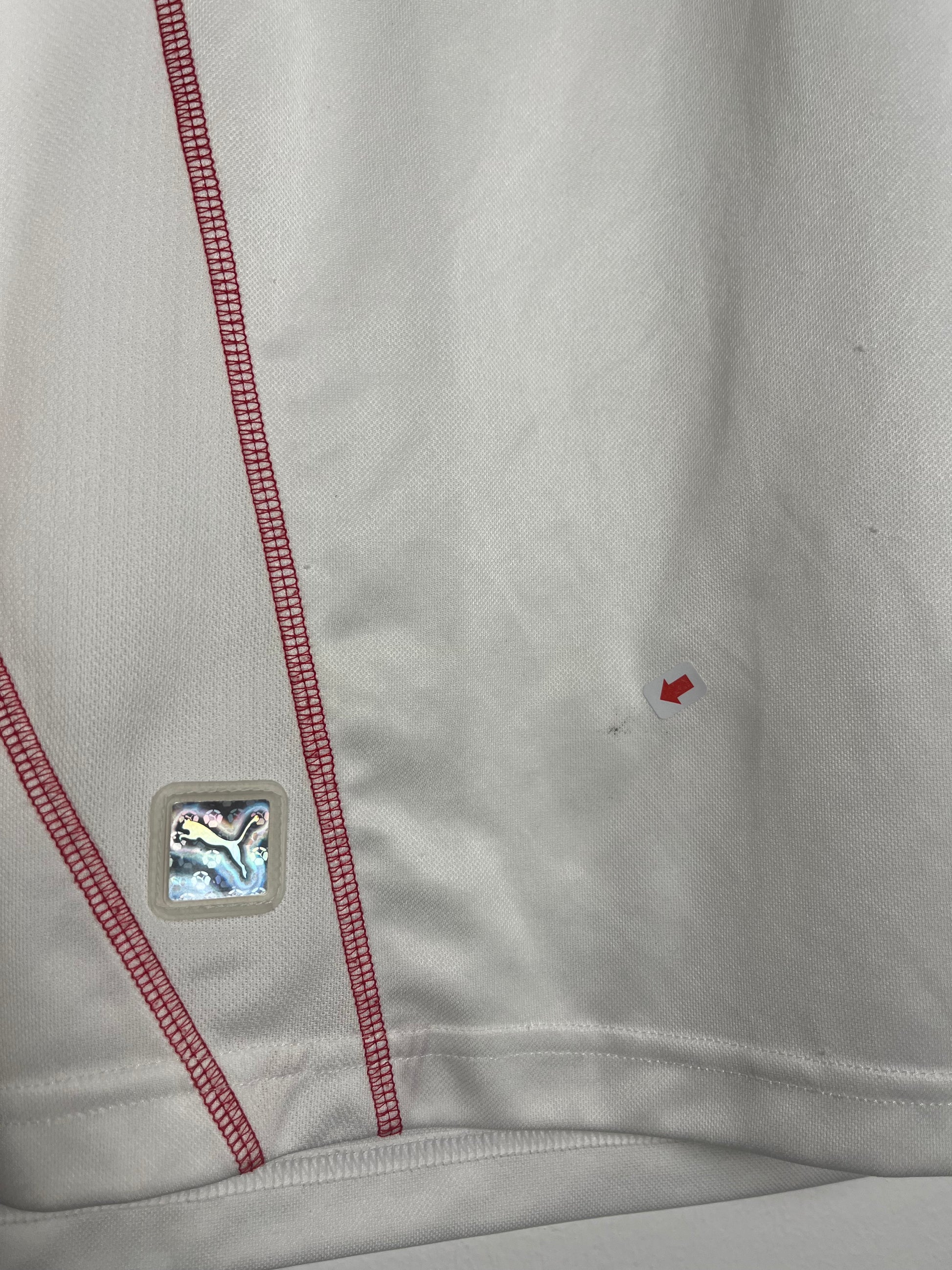 Ein kleiner, jedoch deutlich erkennbare Verfärbung auf der Vorderseite des Trikots. Der Stoff weist die ein oder andere Gebrauchsspur auf. Achtung: Der Rückenflock entspricht laut unserer Recherche nicht zu 100 Prozent der Original-Bedruckung.